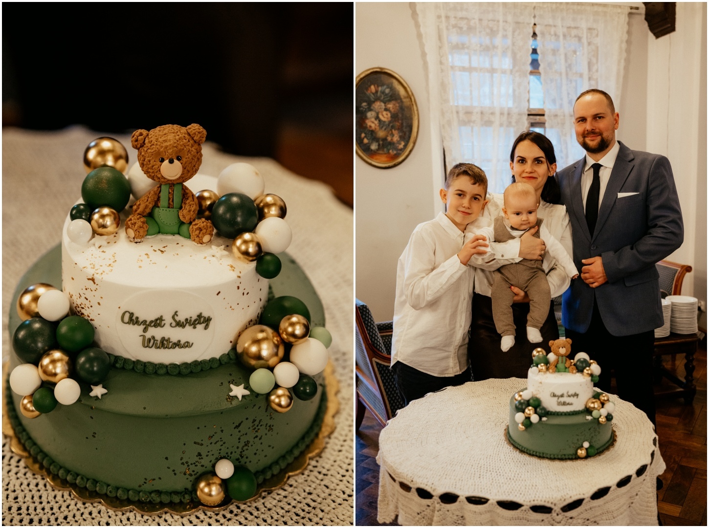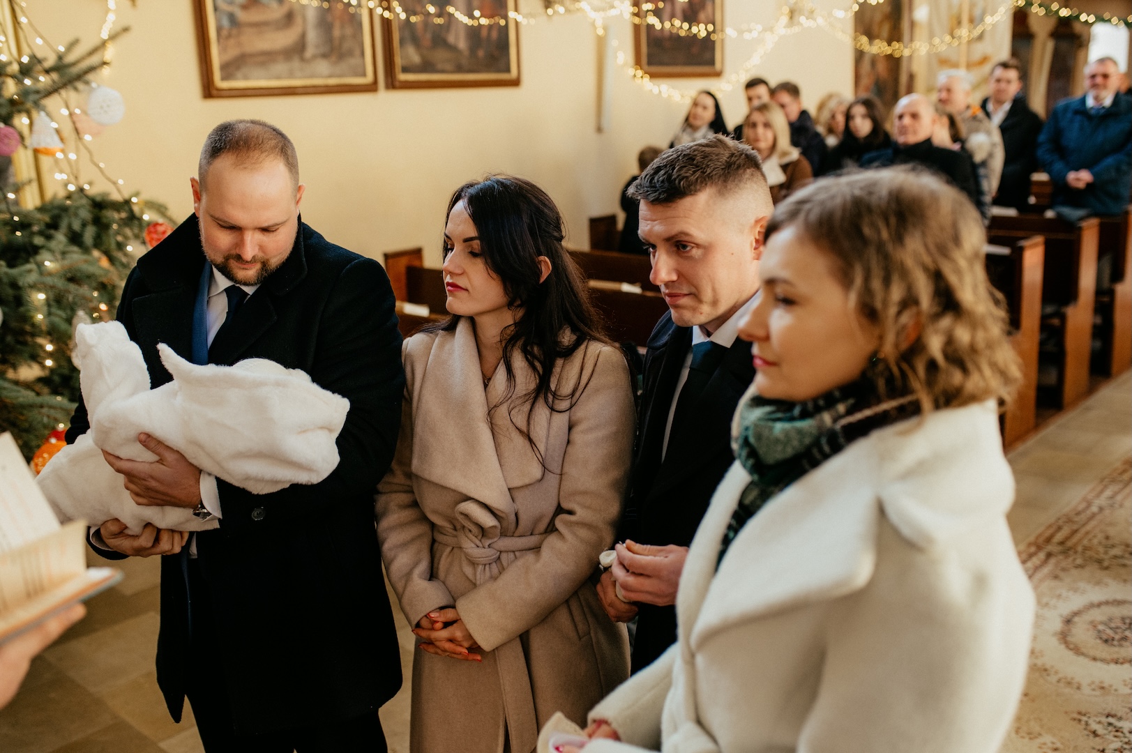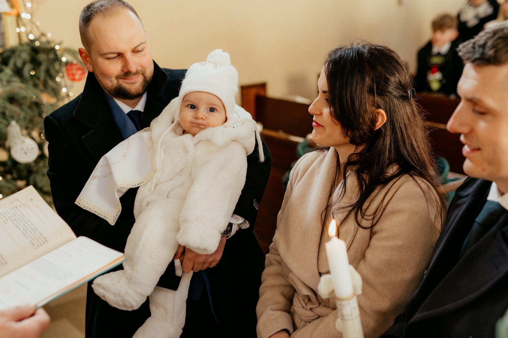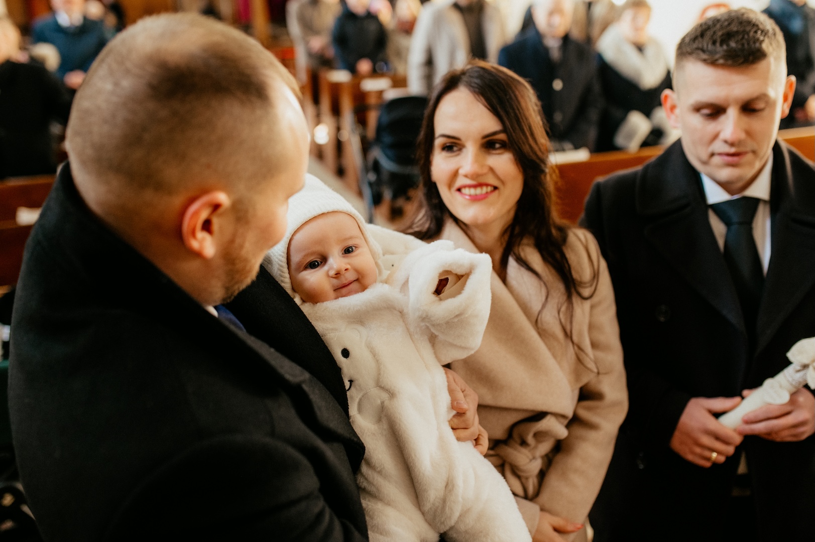 Tym razem powodem do spotkania był Chrzest Święty małego Wiktora. Ponieważ uroczystość odbyła się w okresie Bożego Narodzenia, kościół przywitał nas fantastycznym klimatem – wszędzie stały pięknie przyozdobione choinki i świąteczne dekoracje, co dodało zdjęciom wyjątkowego ciepła. Sam główny bohater, Wiktor, spisał się na medal i z dużą cierpliwością (i spokojem!) zniósł tradycyjne lanie wodą.