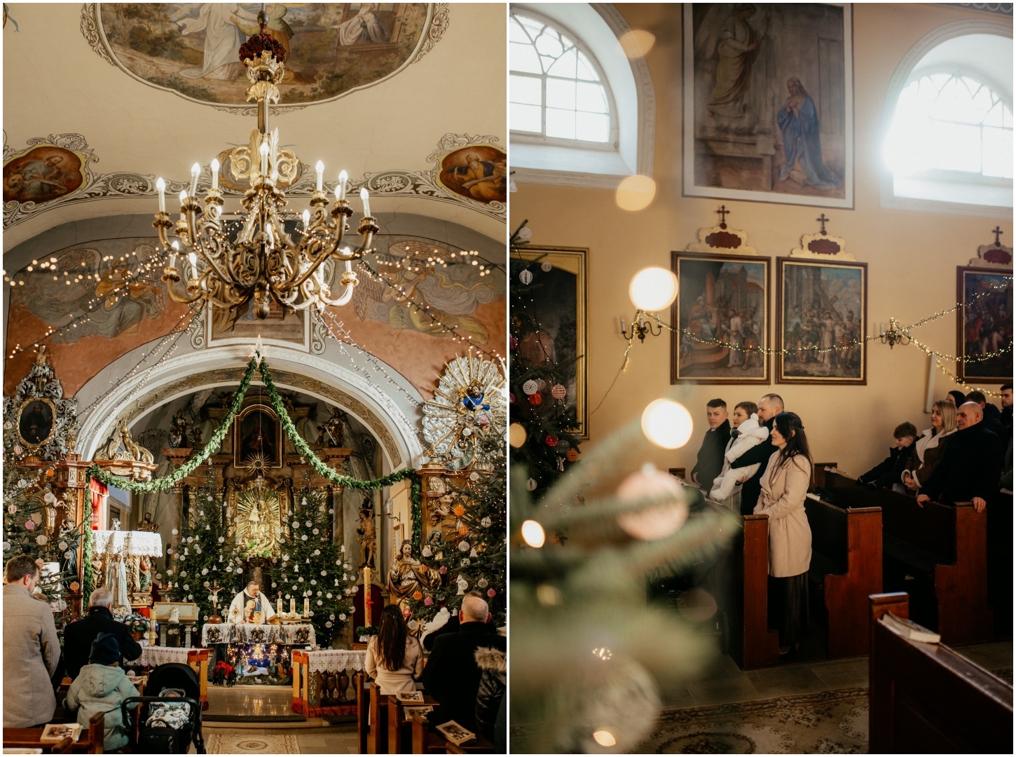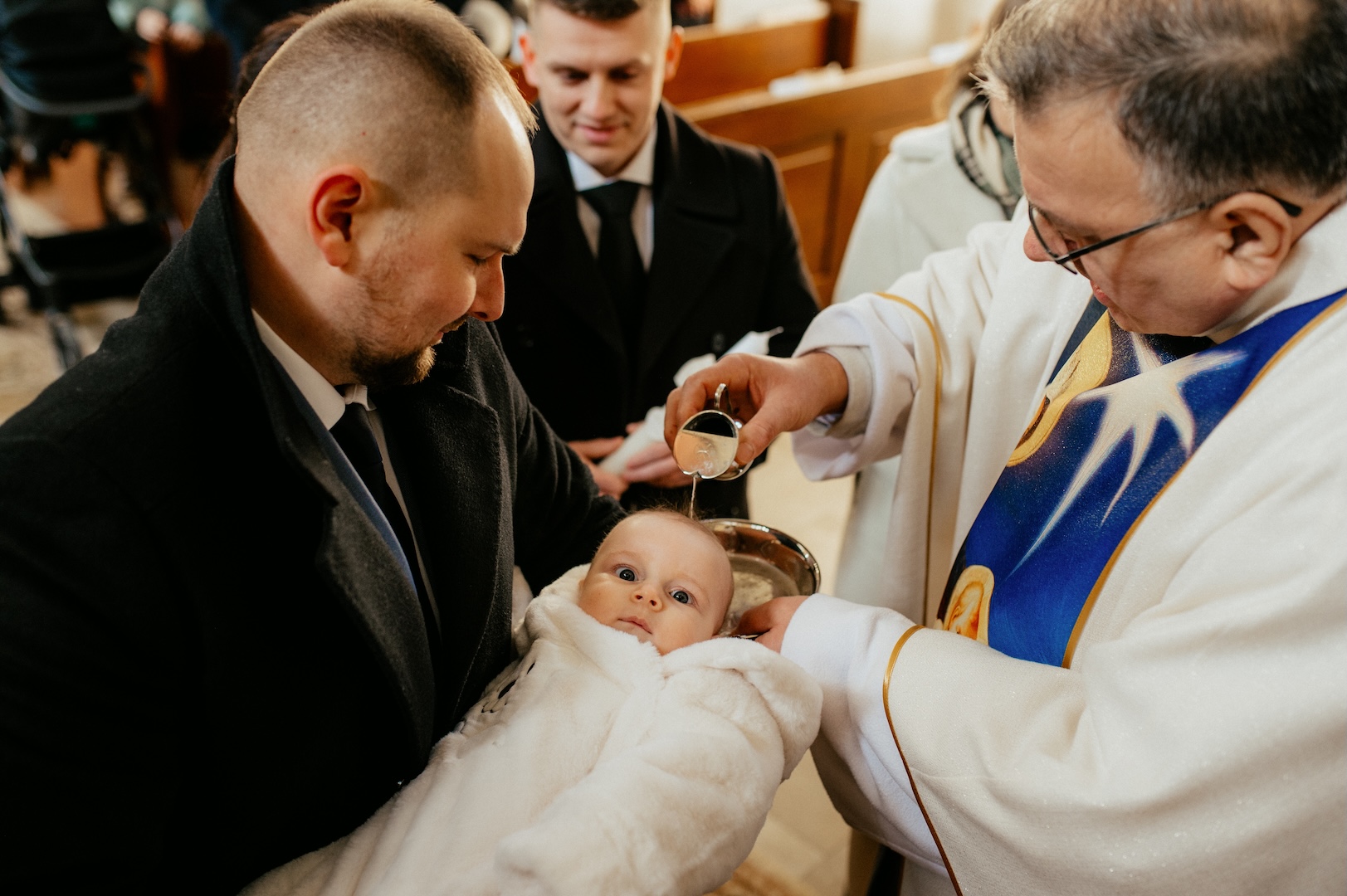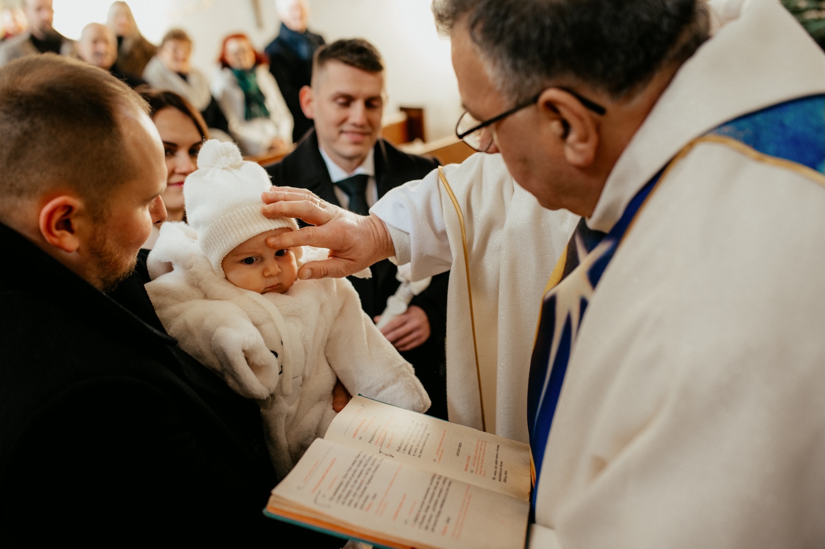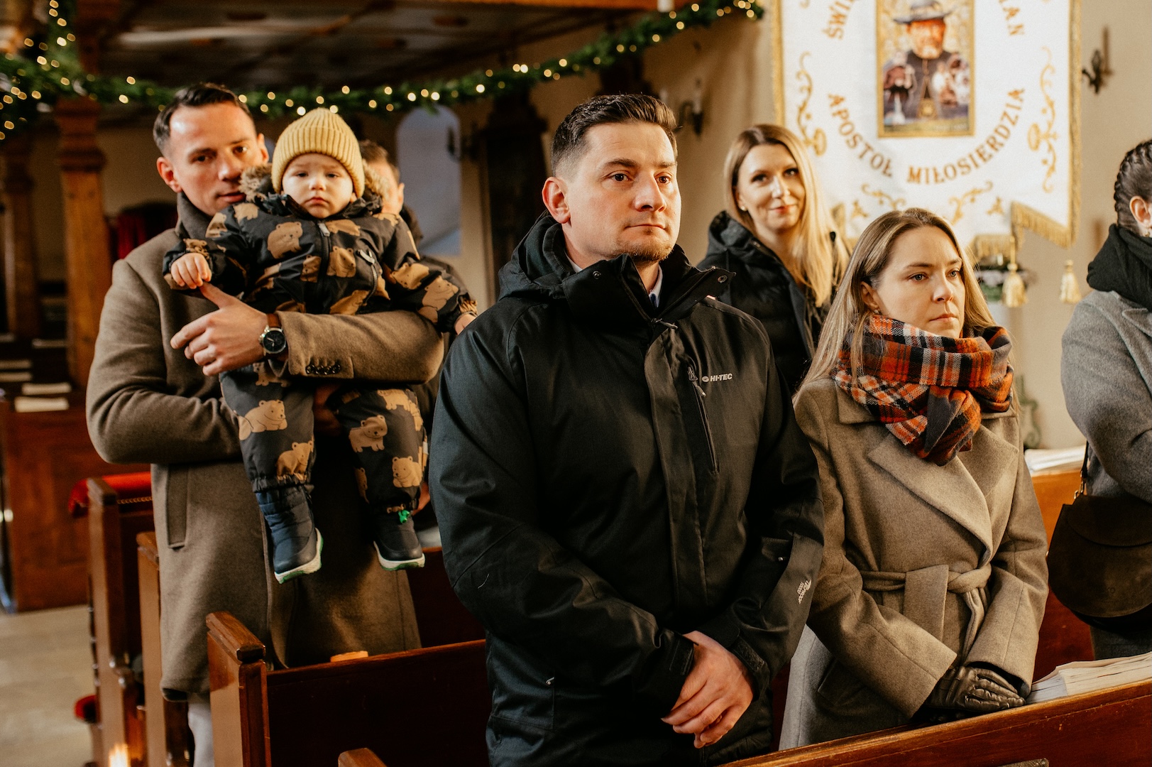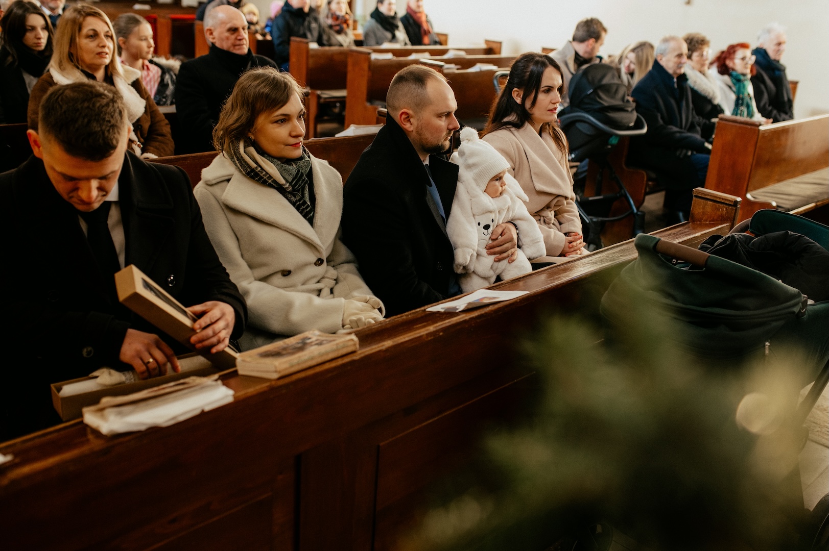 Tym razem powodem do spotkania był Chrzest Święty małego Wiktora. Ponieważ uroczystość odbyła się w okresie Bożego Narodzenia, kościół przywitał nas fantastycznym klimatem – wszędzie stały pięknie przyozdobione choinki i świąteczne dekoracje, co dodało zdjęciom wyjątkowego ciepła. Sam główny bohater, Wiktor, spisał się na medal i z dużą cierpliwością (i spokojem!) zniósł tradycyjne lanie wodą.