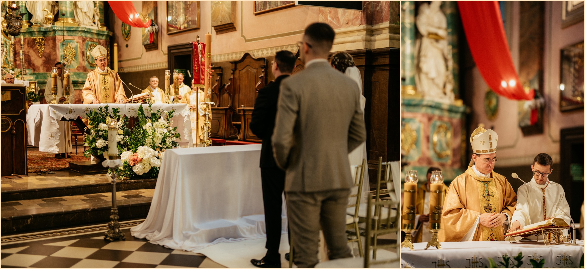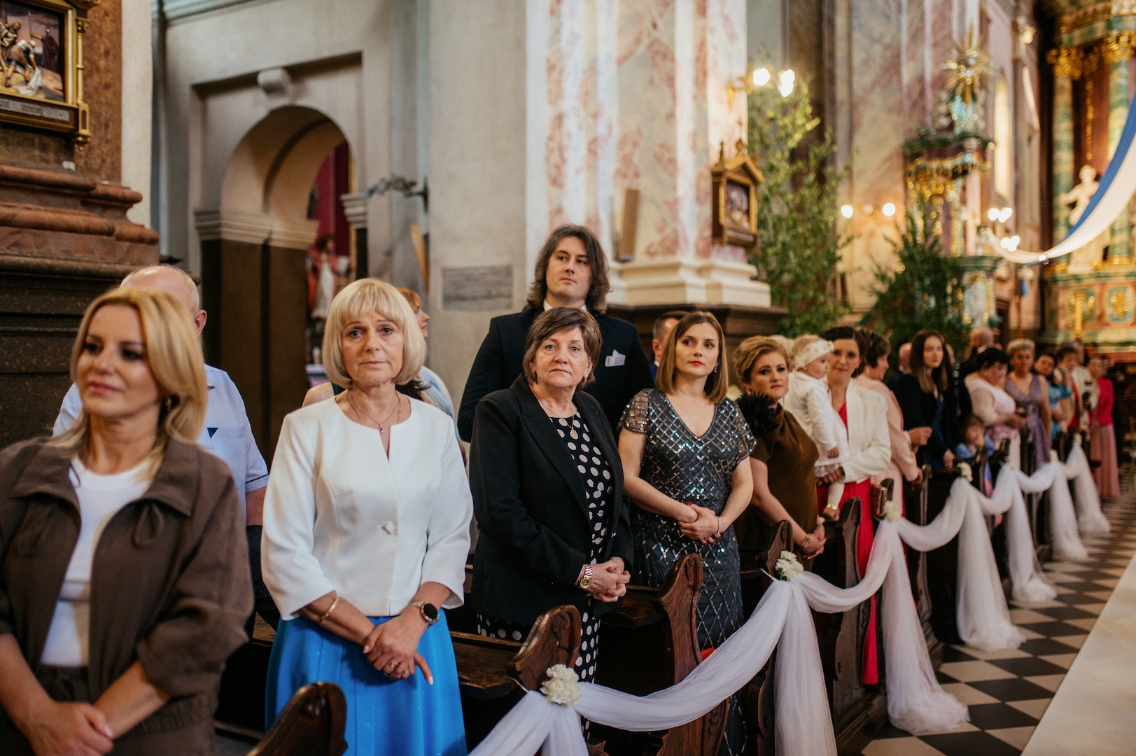 Przy tak monumentalnym wnętrzu i skali uroczystości praca we dwoje bardzo ułatwia sprawę. Taka przestrzeń to dla fotografa wyzwanie, ale w duecie mogliśmy swobodnie rozstawić się w różnych punktach świątyni. Dzięki temu, gdy jedno z nas skupiało się na szerokich kadrach pokazujących dostojeństwo architektury, drugie mogło być blisko Pary Młodej, wyłapując każde spojrzenie i gest. Praca w parze daje ten komfort, że nawet w tak ogromnym kościele nic nam nie umyka, a my możemy pokazać całe spektrum emocji z zupełnie różnych perspektyw.