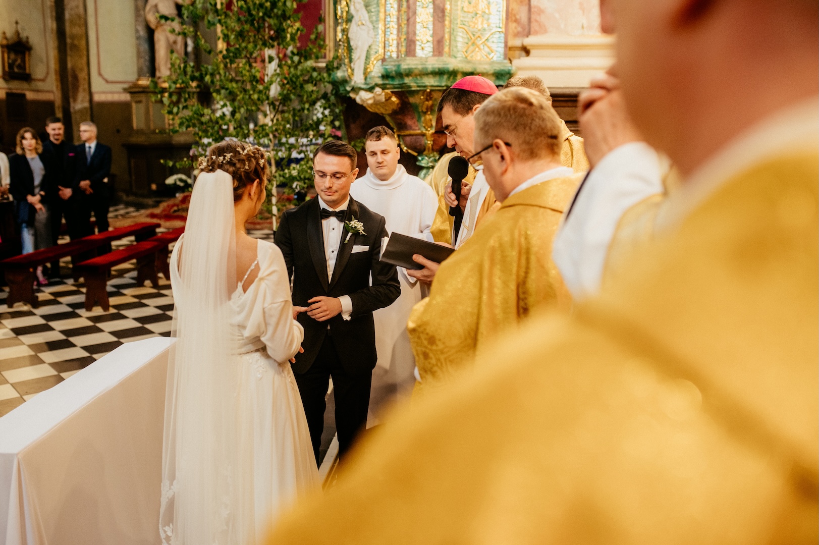 A było co fotografować! Rzadko zdarza się, by uroczystość ślubną prowadził osobiście Biskup w asyście aż siedmiu księży – to nadało wydarzeniu niesamowitej rangi i podniosłości. Oprawa muzyczna również była jedyna w swoim rodzaju, bo za instrumenty i mikrofony chwycili bliscy znajomi oraz rodzice Oli i Grzegorza. Ta schola stworzyła taką atmosferę, że nawet dłuższa liturgia minęła nam wszystkim w mgnieniu oka.