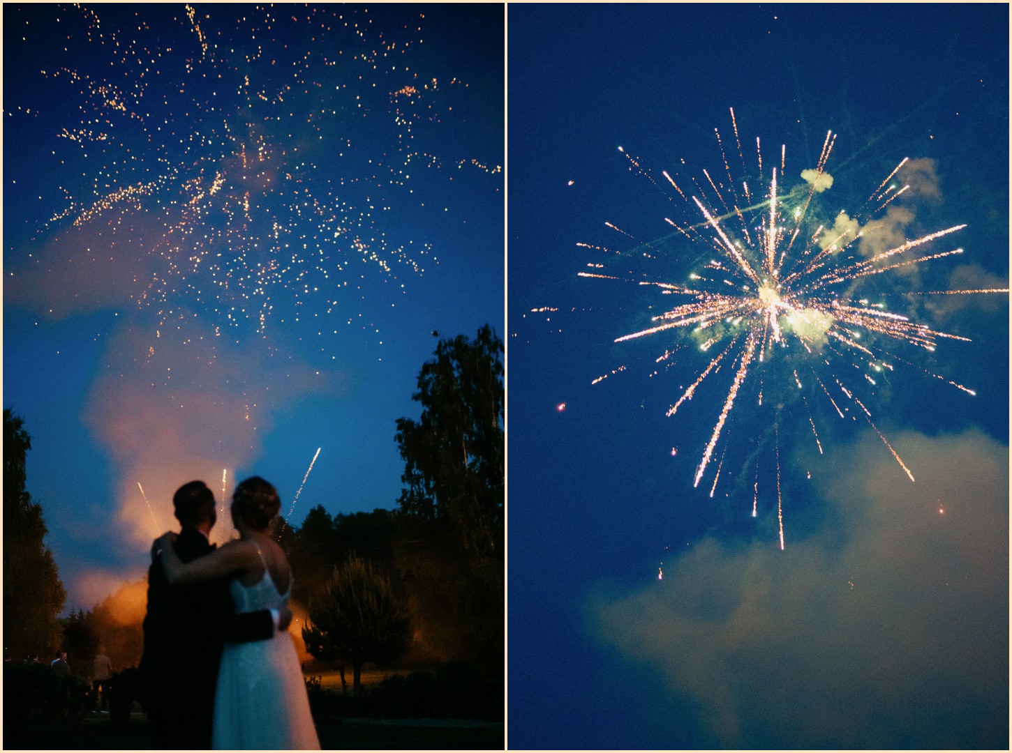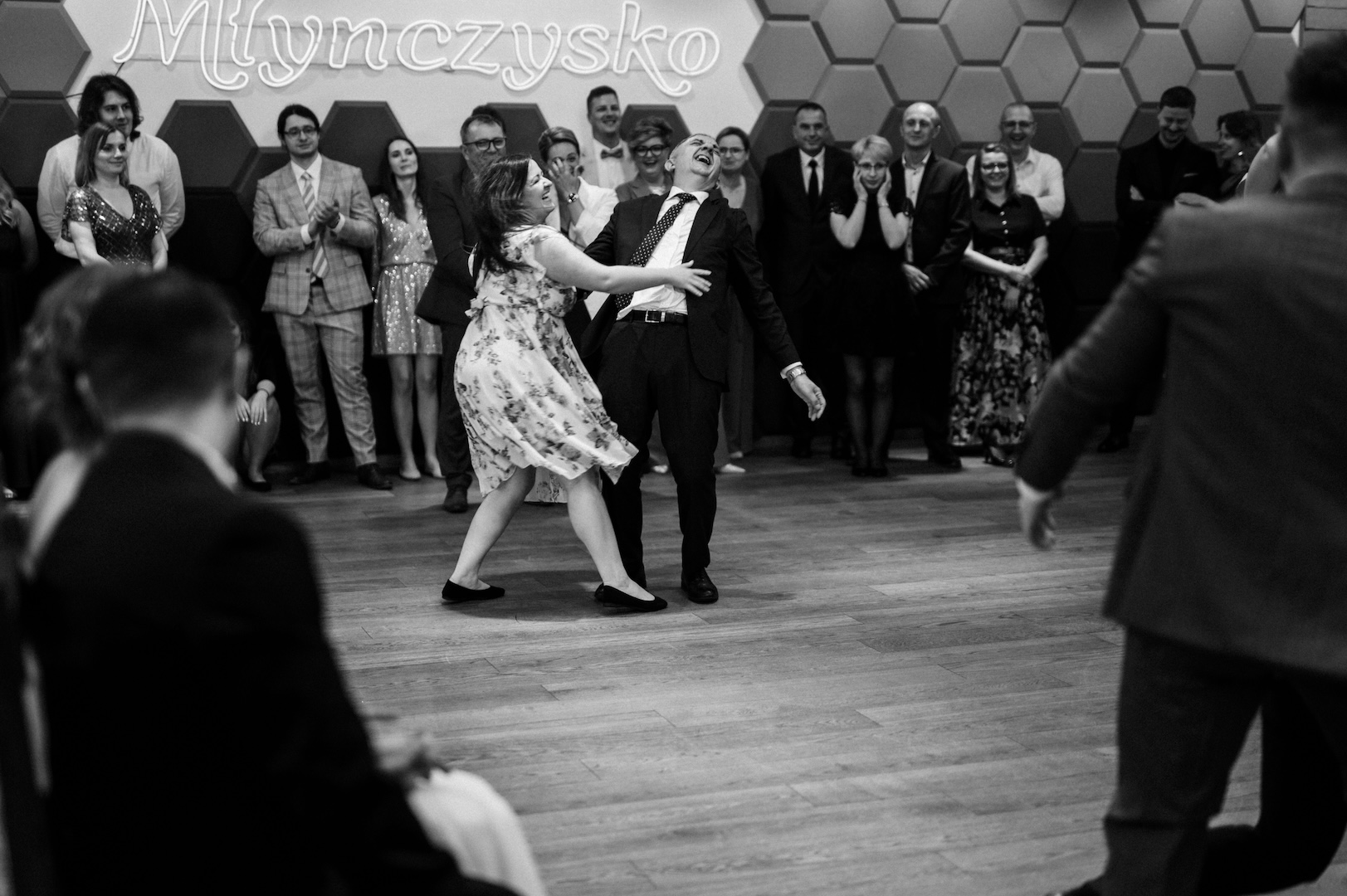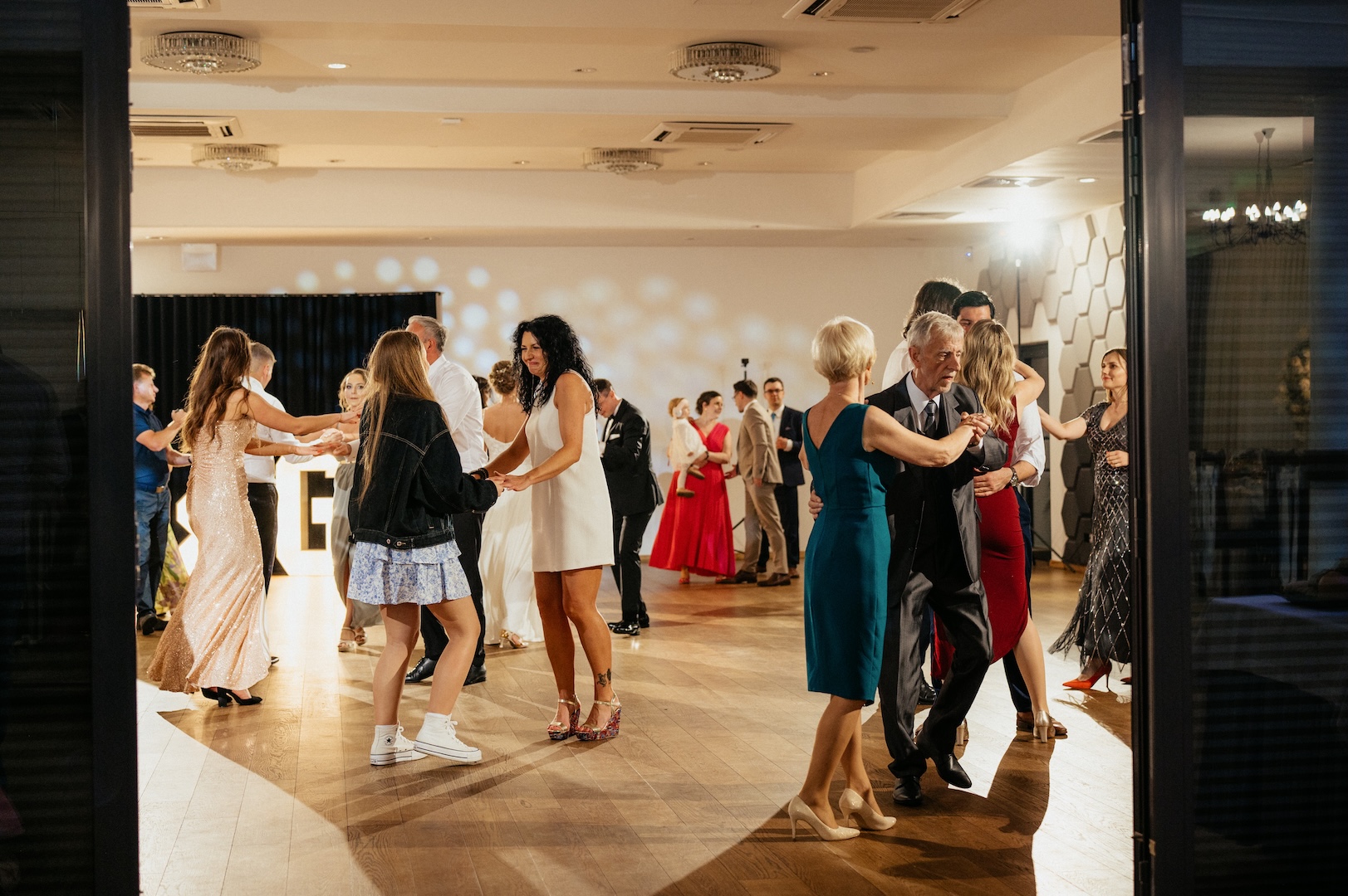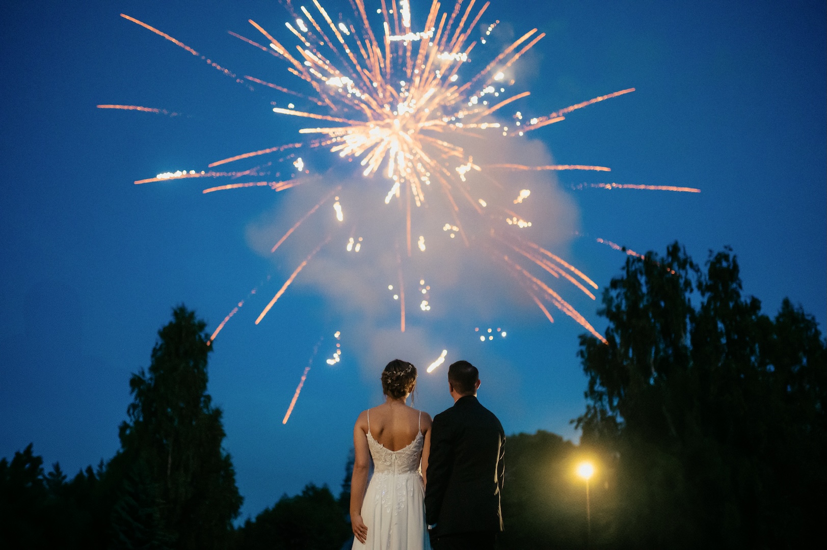 Po ceremonii przenieśliśmy się do Ośrodka „Młynczysko” w Poświętnem, gdzie czekało na nas przyjęcie w klimatycznym otoczeniu. Kiedy tylko zespół Dreszcze uderzył w pierwsze struny, parkiet dosłownie zapłonął. Żywe instrumenty zrobiły robotę – pierwszy taniec i późniejsza zabawa były tak żywiołowe, że trudno było oderwać wzrok od wirujących gości. W międzyczasie udało nam się na chwilę „ukraść” Olę i Grzegorza na krótką sesję we dwoje, by złapać oddech i kilka naturalnych ujęć w otoczeniu ośrodka. Zwieńczeniem tego intensywnego dnia był spektakularny pokaz fajerwerków, który rozświetlił nocne niebo i był idealnym podsumowaniem tej niesamowitej energii.